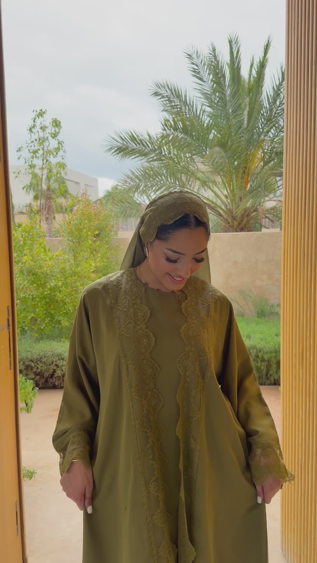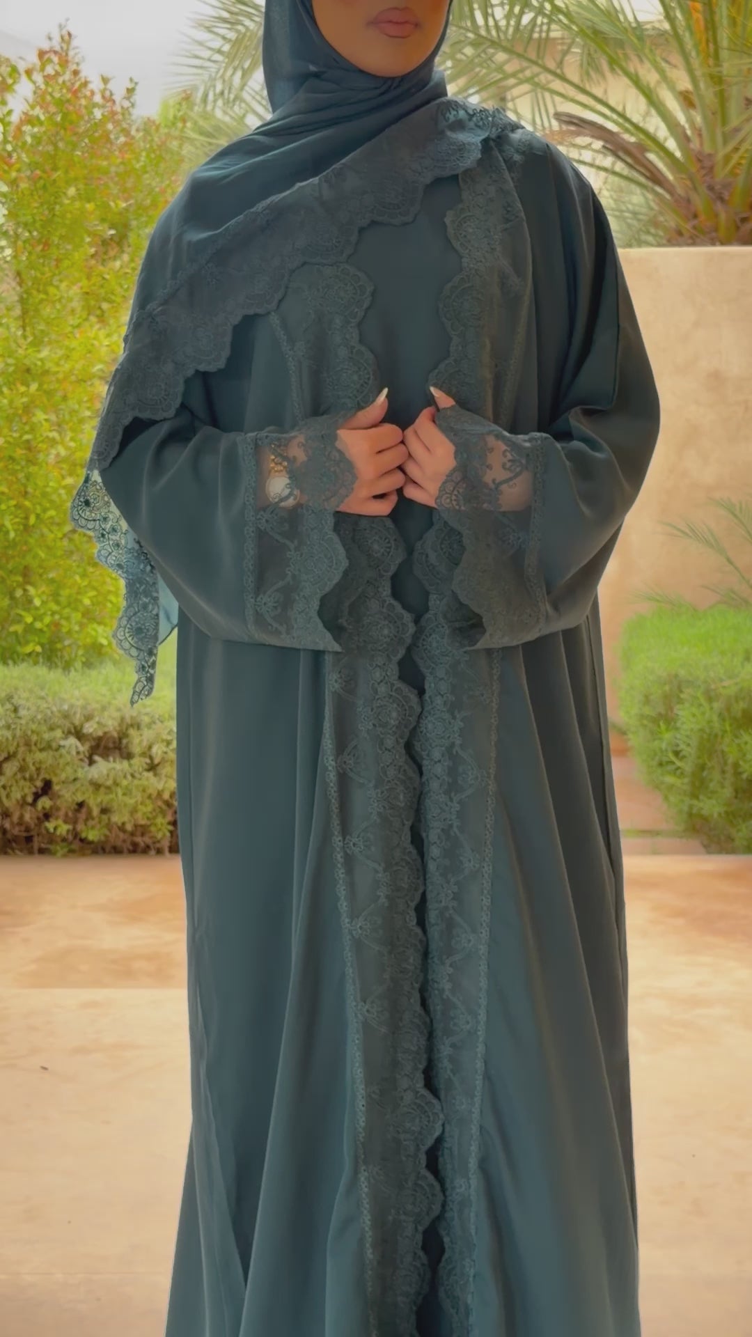 The Solena label Set is a classic and easy-to-wear four-piece abaya that combines comfort and style. It includes a flowy outer abaya with lace detailing along the sleeves and front, a matching slip dress, a lace-trimmed hijab, and a belt for optional shaping and styling.